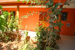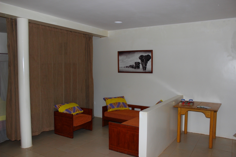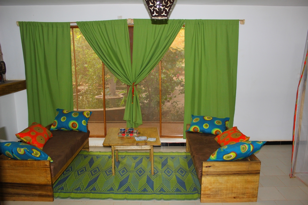 Composé d'une piece avec vue sur le jardin tropical. Un salon, 1 lit double avec moustiquaire et ventilateur, une salle de douche et toilette.
