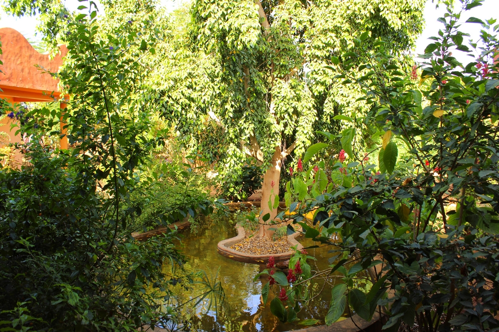 Accès au jardin tropical par la cour intérieure avec bassin à poissons.